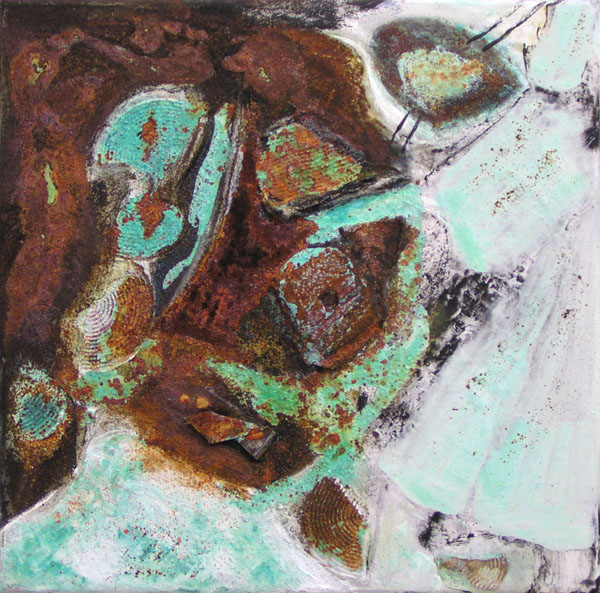 Bodenschätze IV 2009 Kupfer, Eisen, Knochenmehl, Fundstücke, Sand, Titanweiß 30 cm x 30 cm |