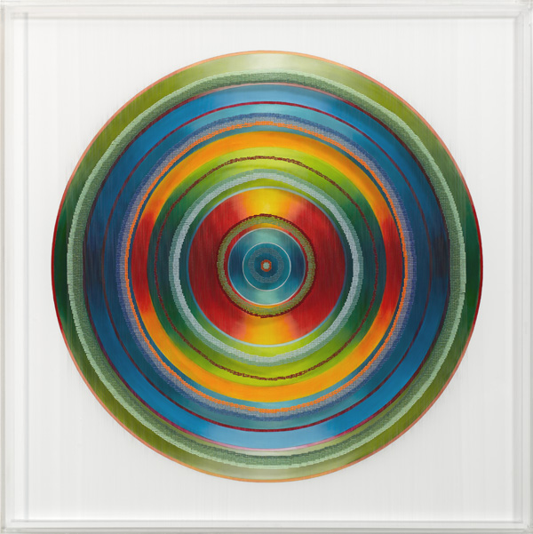 Farbkreis(grün-orange) 2009 Perlen, Nylon, Ölfarbe, Plexiglas 100 cm x 100 cm |